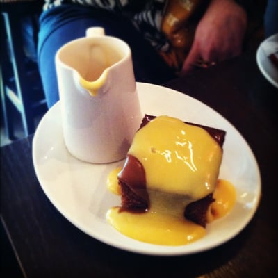 "¡Ah, el segundo es perfecto!" exclamó "Quiero el Sticky Toffee Pudding... y un té helado".